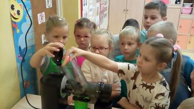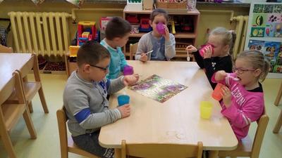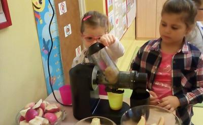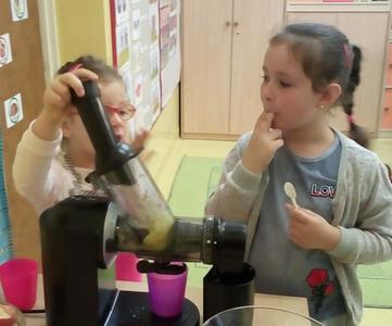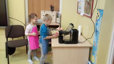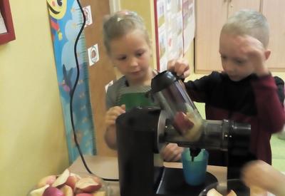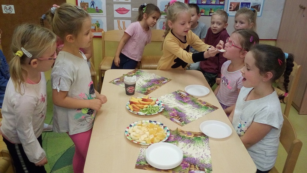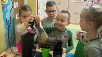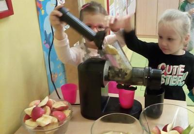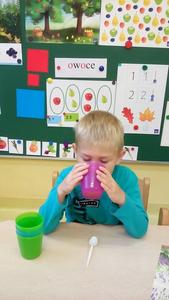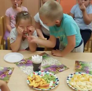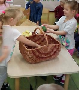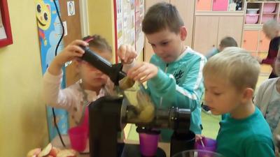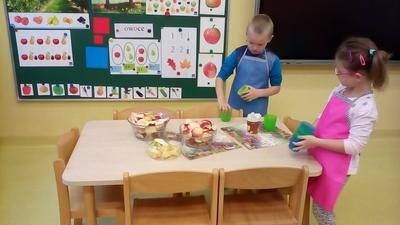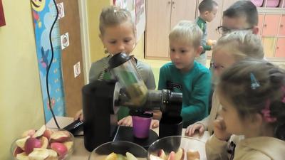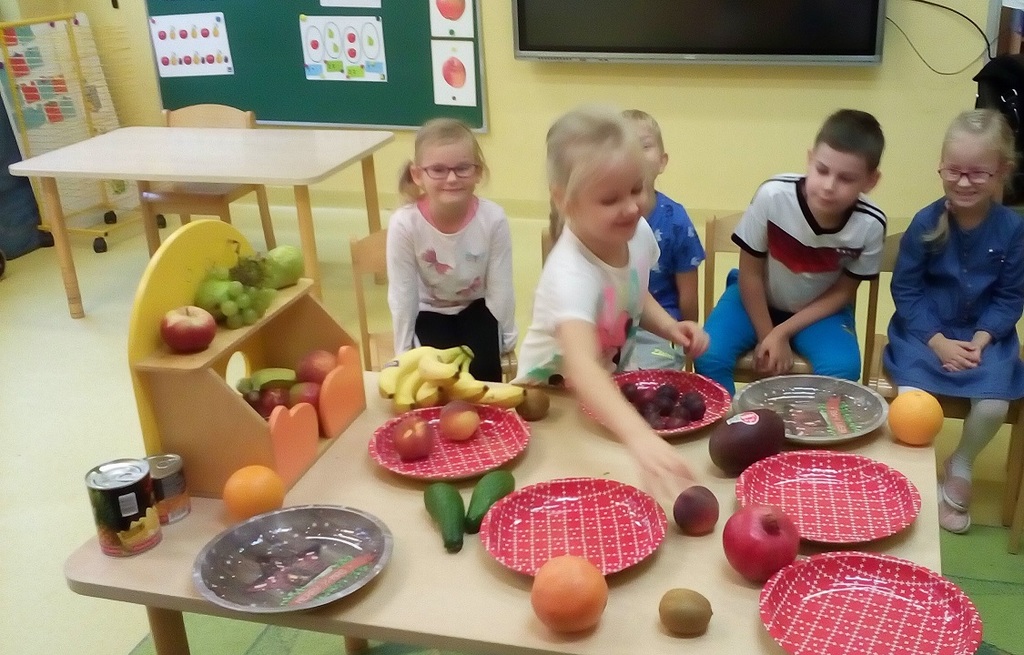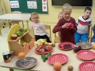 Tydzień upłynął także na poznawaniu owoców i warzyw. Przyniesione owoce służyły do wielu zabaw badawczych, podczas których dzieci :przeliczały, klasyfikowały, rozpoznawały po kształcie i zapachu a następnie degustowały. Zabawy z owocami zakończyliśmy przygotowaniem świeżo wyciskanego soku.