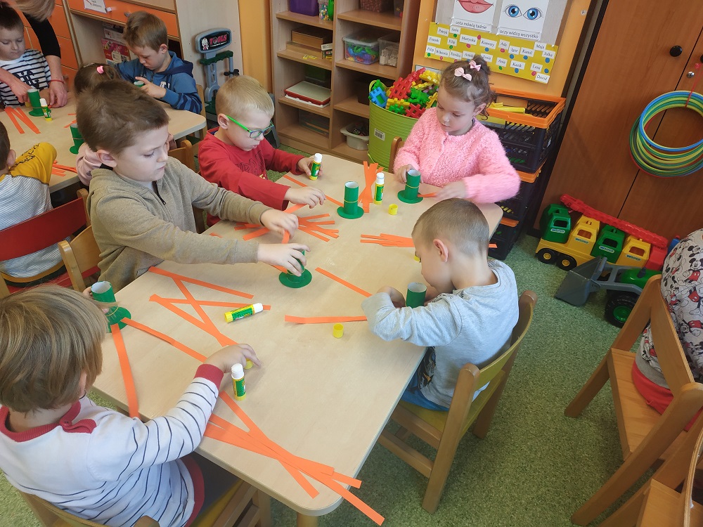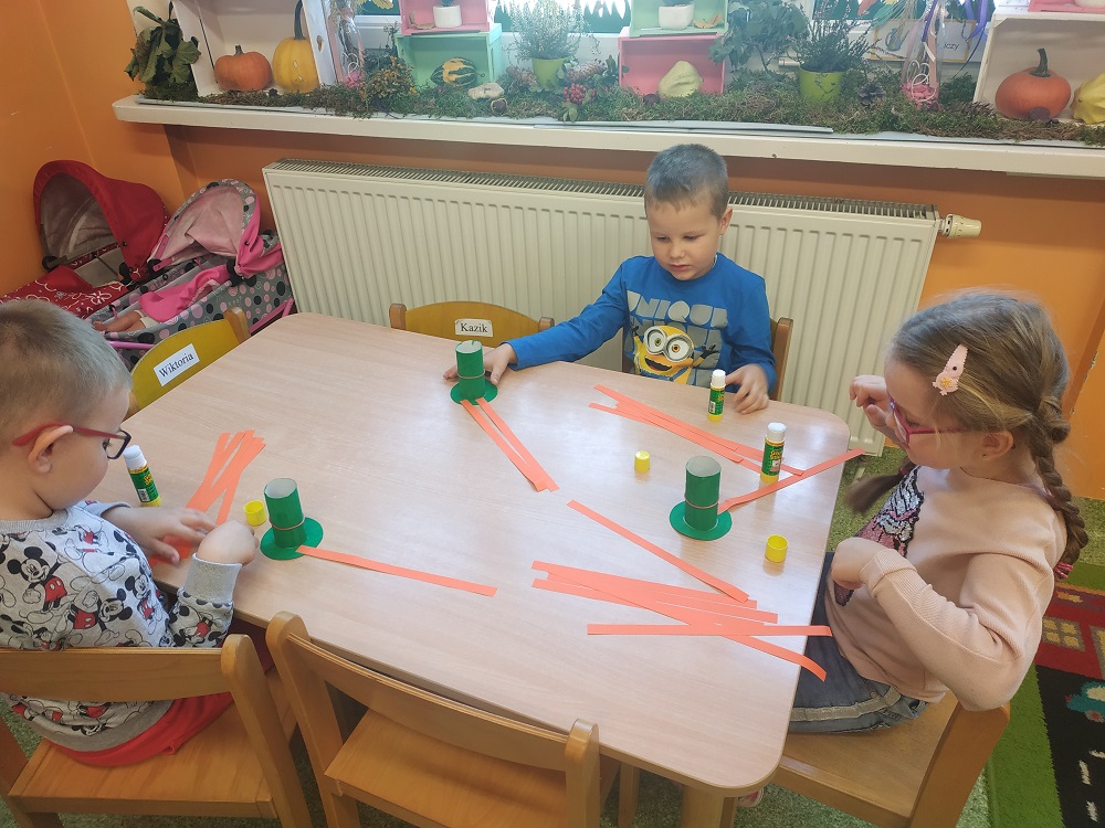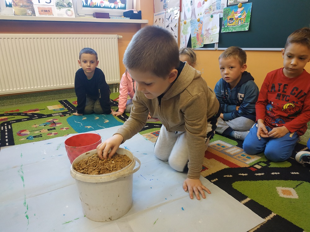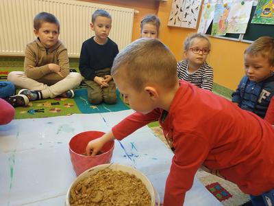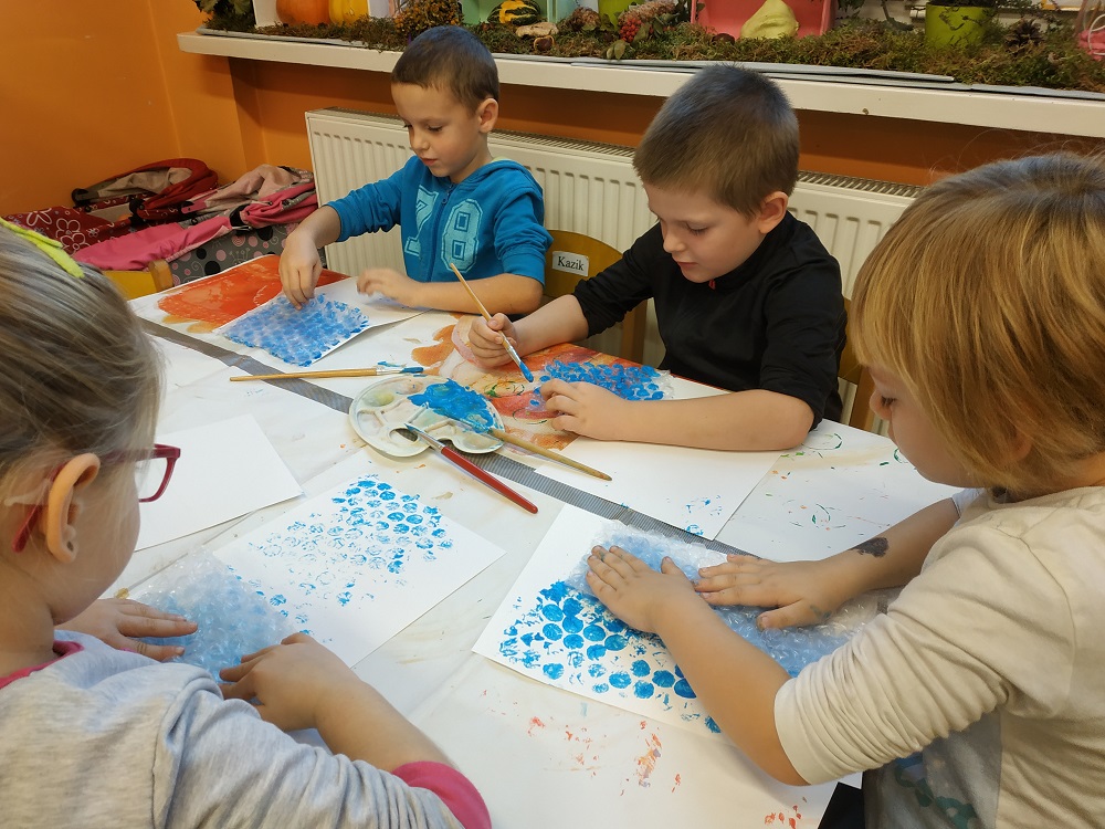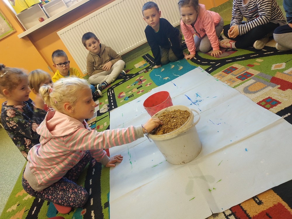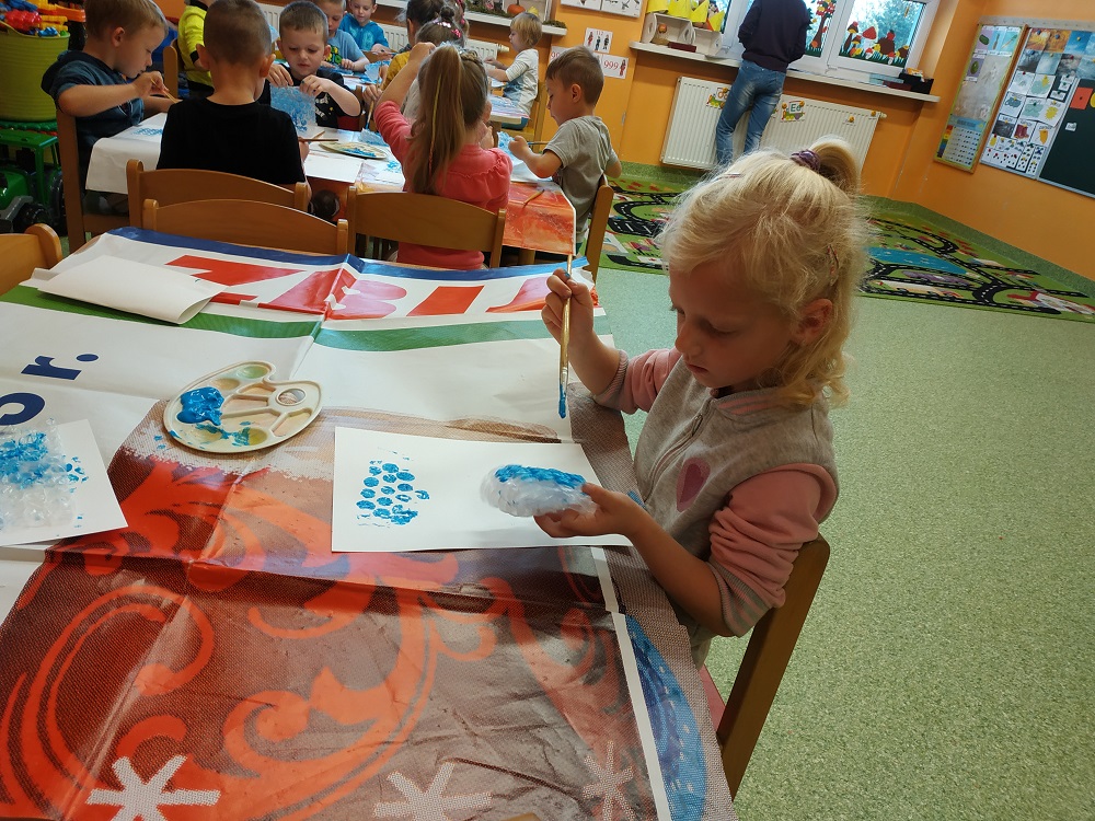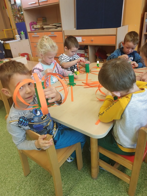 W ostatnim czasie dzieci z oddziału pięciolatków dowiedziały się między innymi jak wygląda glina i co z niej możemy „wyczarować”. Poznały jak powstaje chleb. Omawialiśmy tematykę związaną z jesienną pogodą. Oprócz zabaw badawczych dzieci odkryły nowe literki „M” oraz „E”. W naszej grupie królowymi literek były: Maja, Martynka oraz Emilka. W ostatnich tygodniach zrobiliśmy wiele prac plastycznych między innymi przestrzenne dynie czy malowaliśmy deszczową pogodę oraz wyklejaliśmy parasol.