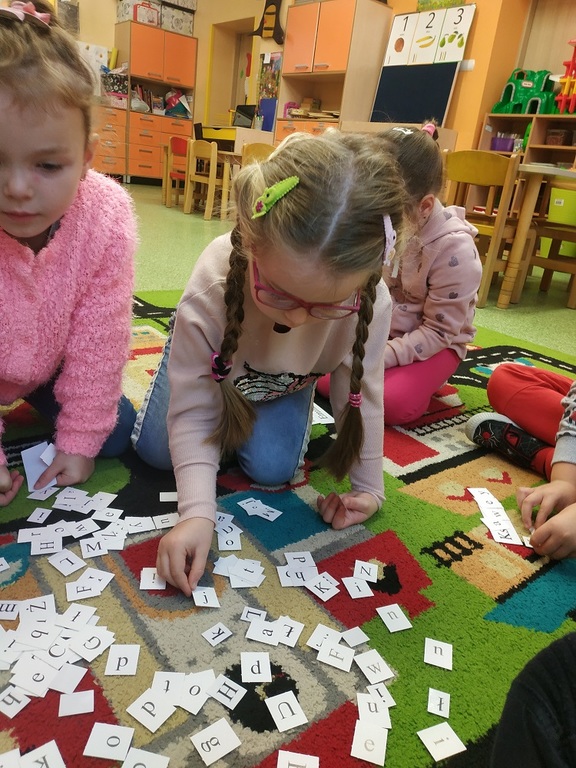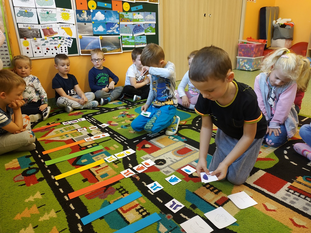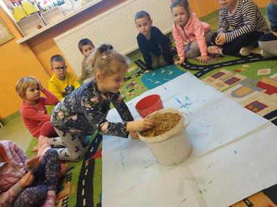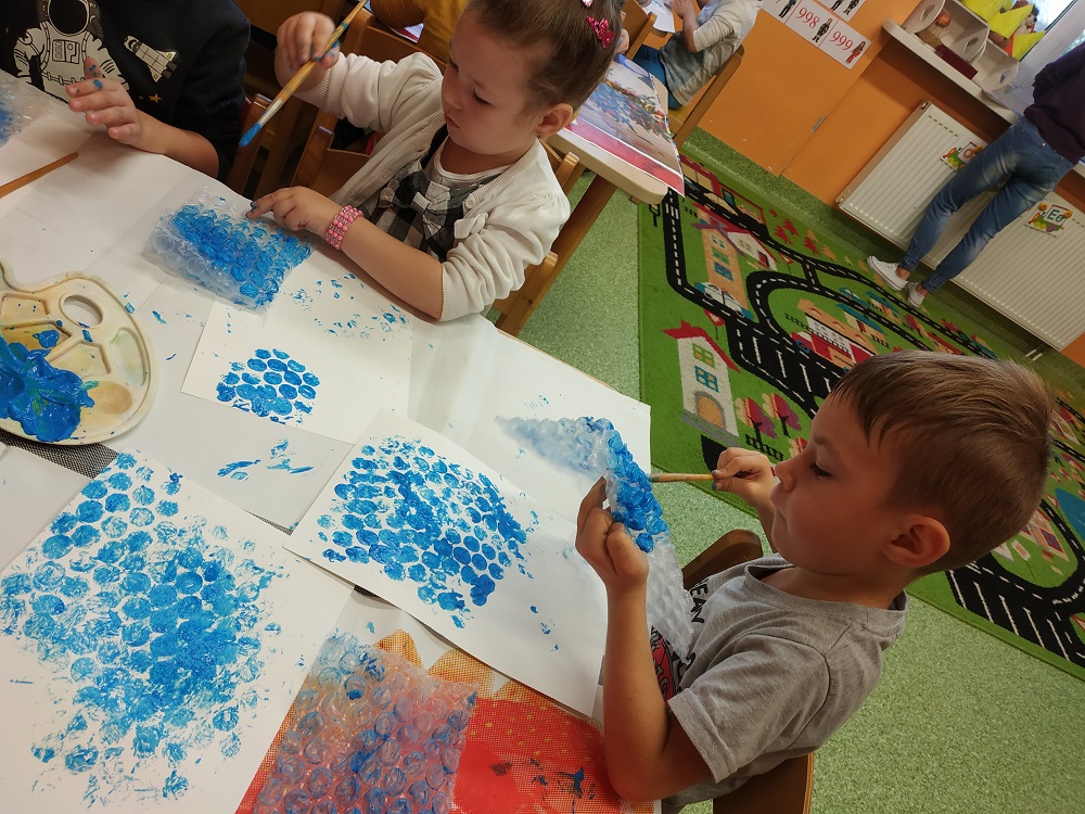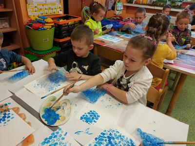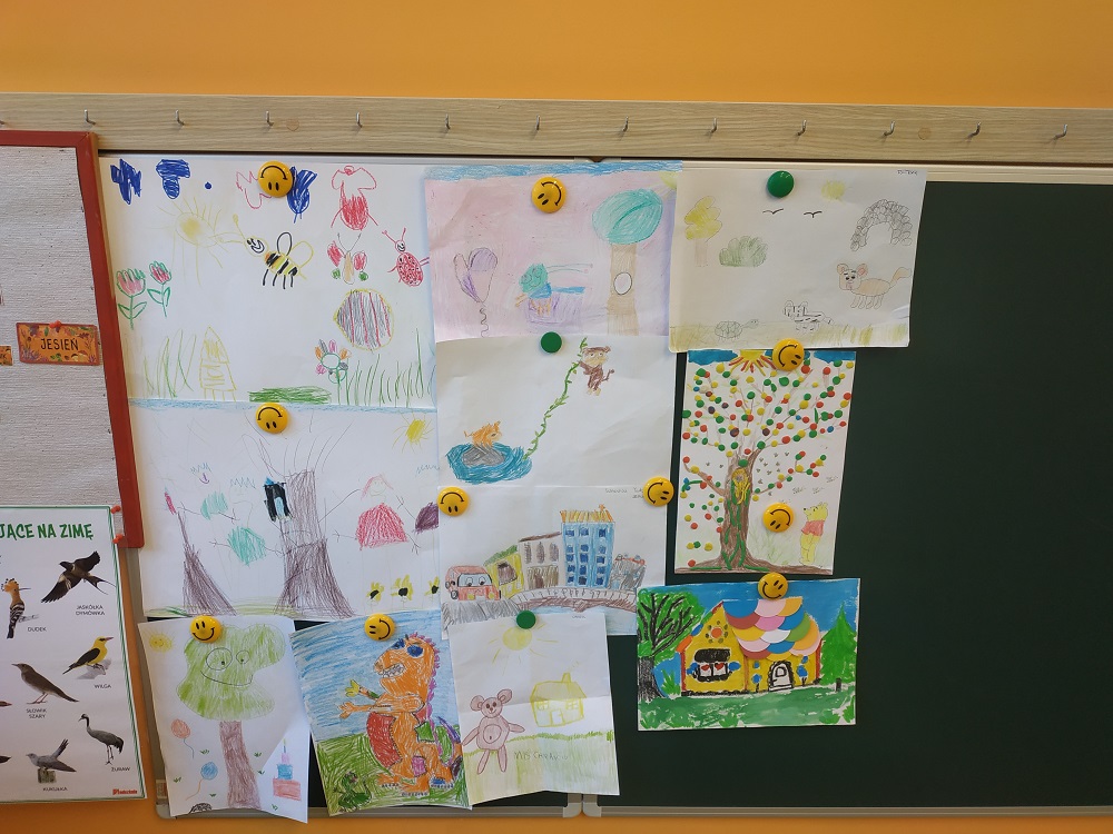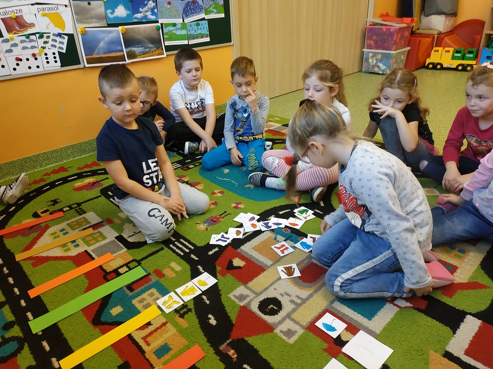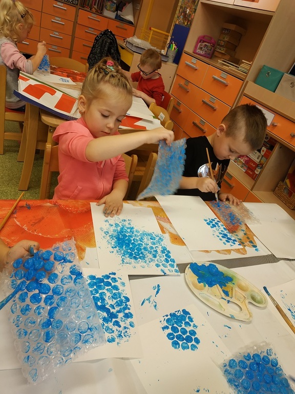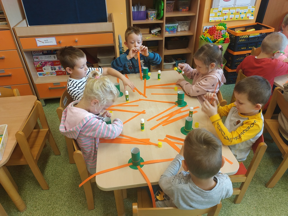 W ostatnim czasie dzieci z oddziału pięciolatków dowiedziały się między innymi jak wygląda glina i co z niej możemy „wyczarować”. Poznały jak powstaje chleb. Omawialiśmy tematykę związaną z jesienną pogodą. Oprócz zabaw badawczych dzieci odkryły nowe literki „M” oraz „E”. W naszej grupie królowymi literek były: Maja, Martynka oraz Emilka. W ostatnich tygodniach zrobiliśmy wiele prac plastycznych między innymi przestrzenne dynie czy malowaliśmy deszczową pogodę oraz wyklejaliśmy parasol.