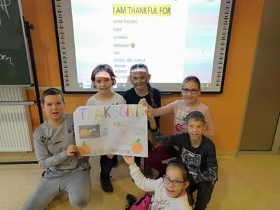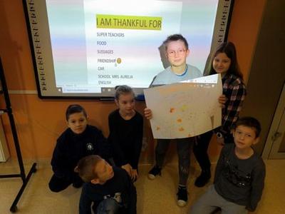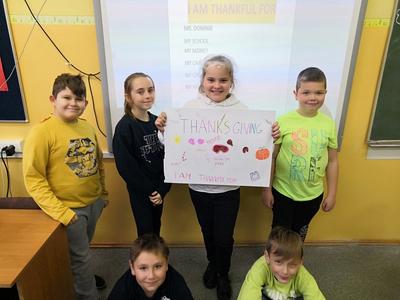 Podczas zajęć z języka angielskiego uczniowie klasy 5A oraz 5B poszerzyli swoją wiedzę kulturową z zakresu kultury amerykańskiej. Podczas zajęć uczniowie czytali tekst na temat Thanksgiving czyli święta dziękczynienia, które obchodzone jest w ostatni czwartek listopada w Stanach Zjednoczonych. Uczniowie wykonywali plakaty na temat święta.