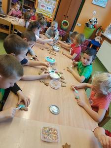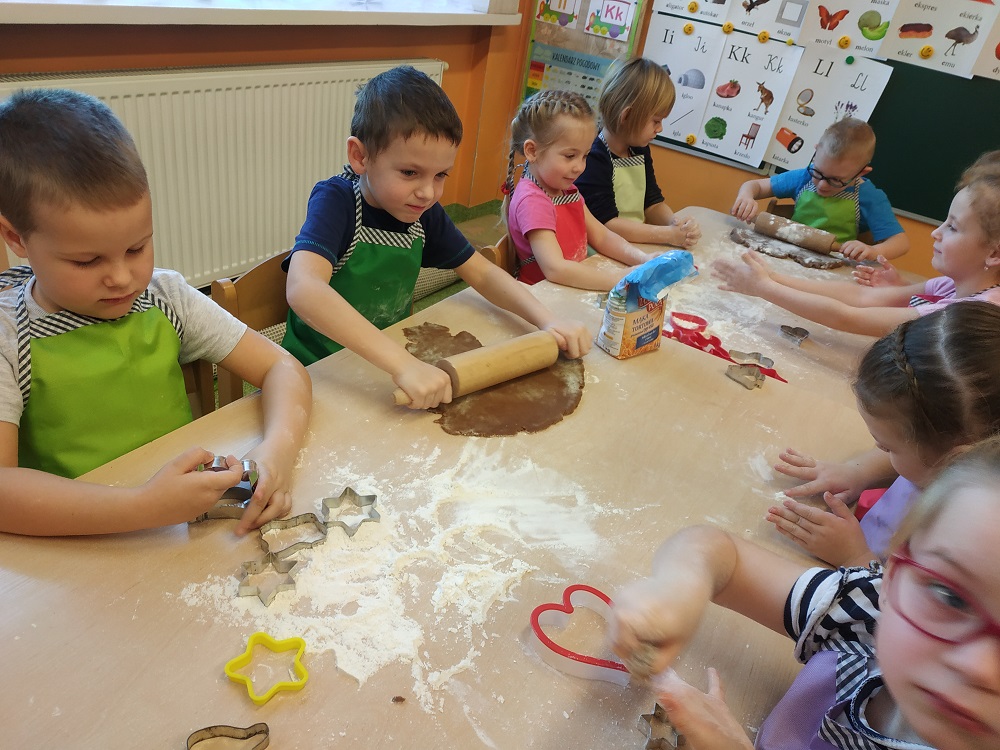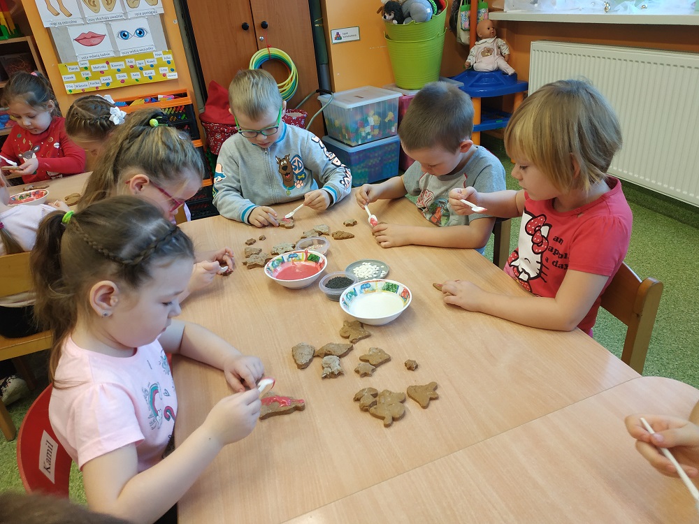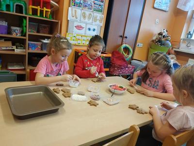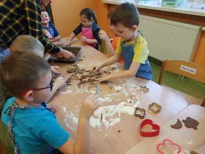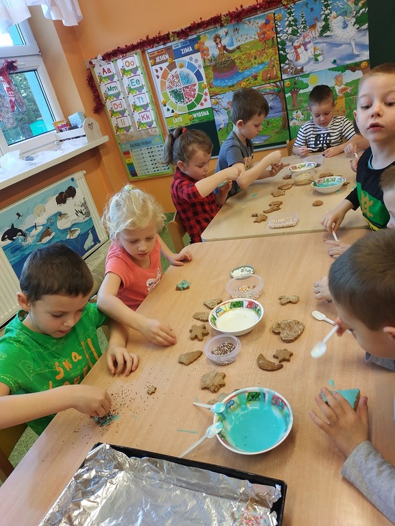 W ostatnim czasie pięciolatki zgodnie z przedświąteczną tradycją upiekły pyszne świąteczne pierniczki. Z pomocą mam praca z przygotowaniem wypieków szła sprawnie i bez trudu. Przedszkolaki wygniatały i wałkowały ciasto według przygotowanych wcześniej przepisów. Wszystkim podobało się wykrawanie świątecznych kształtów – choinek, gwiazdek, bałwanków, aniołków, przy pomocy foremek. Gdy pierniczki były już gotowe dzieci przystąpiły do ich dekorowania lukrem i barwnymi posypkami. Zabawa była doskonała, a pierniczki wyszły przepiękne.