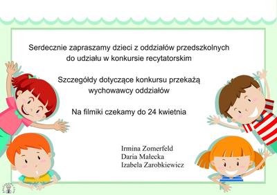 Konkurs recytatorski w przedszkolu Zdjęcia Zobacz również Kreatywne przedszkolaki :) Konkurs plastyczny pt: "Ozdoba Wielkanocna" Przygotowania do świąt... Konkurs recytatorski w przedszkolu Co słychać u naszych przedszkolaków? Przedszkolaki :) 17 kwietnia 2020 Oddziały przedszkolne Wydrukuj Udostępnij Wyświetlono: 209