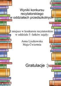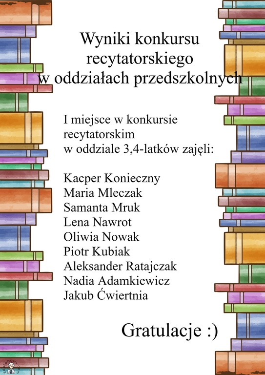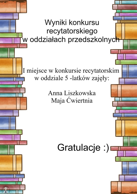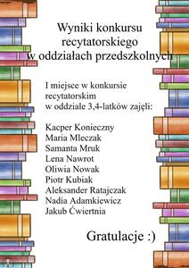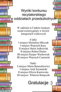 Wyniki konkursu recytatorskiego w oddziałach przedszkolnych Zdjęcia Zobacz również Konkurs recytatorski w przedszkolu Co słychać u naszych przedszkolaków? Przedszkolaki :) Wyniki konkursu recytatorskiego w oddziałach przedszkolnych... Nasze przedszkolaki :) Dzień Kropki w przedszkolu 29 kwietnia 2020 Oddziały przedszkolne Wydrukuj Udostępnij Wyświetlono: 234