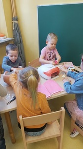 Dzieci z grupy 5,6-latków poznawały zawody. Dzięki zaangażowaniu rodziców, którzy nagrali filmiki z miejsc pracy, dzieci miały okazję poznać m. in. zawód i narzędzia pracy stolarza, hydraulika, ekspedientki, operatora wózka widłowego, spawacza, rolnika, kierowcy, kucharza.