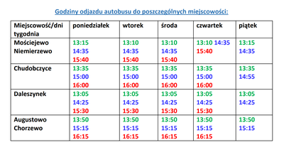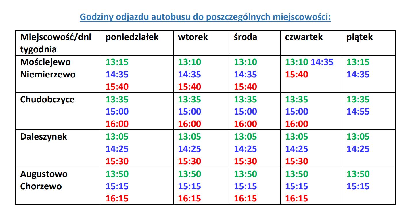 Plan dowozów i odwozów w roku szkolnym 2021/2022 Zdjęcia Załączniki godziny_odjazdu_autobusu_do_poszczegolnych_miejscowosci.pdf [76.40 kB] Zobacz również Konkurs z okazji Dnia Taty Rozstrzygniecie świetlicowego konkursu plastycznego... Świetlica szkolna i stołówka Plan dowozów i odwozów w roku szkolnym 2021/2022 KARTA ZGŁOSZENIA DZIECKA DO ŚWIETLICY SZKOLNEJ Z życia świetlicy 13 września 2021 Świetlica szkolna i stołówka Wydrukuj Udostępnij Wyświetlono: 146