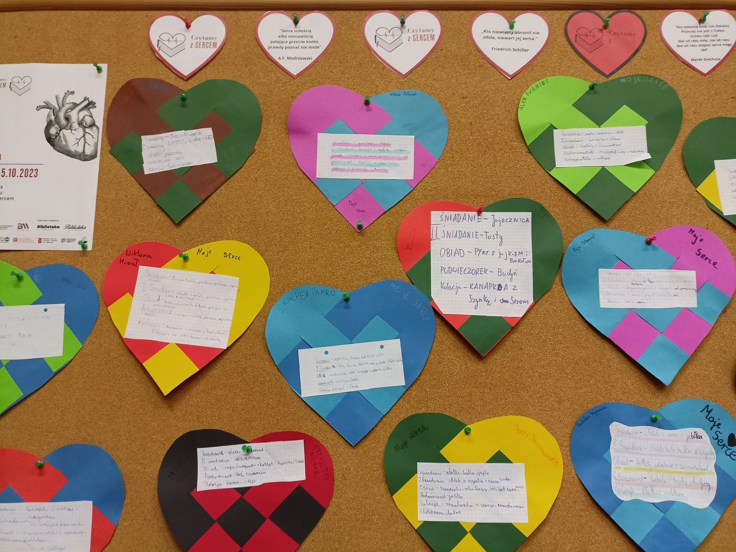 W dniach 29.09.23-5.10.2023 nasza szkoła uczestniczy w akcji promującej czytelnictwo oraz zdrowy styl życia. Jako pierwsza wystartowała klas 2b, która na zajęciach czytelniczych poznała fragmenty książki ,,Ludzkie ciało". Wykorzystaliśmy wspólnie spędzony czas na wykonaniu serca promującego akcję w naszej szkole. W czwartek do biblioteki szkolnej zawitała klasa 4. Wraz z uczniami wybraliśmy najciekawsze cytaty poświęcone sercu i przygotowaliśmy symbole akcji. Na korytarzu szkolnym pojawiły się gazetki ,,Czytamy z Sercem", w świetlicy szkolnej ,,Alfabet zdrowego serca" (materiały od promotora akcji), w bibliotece (w kąciku pod drzewem) prezentujemy literaturę popularnonaukową jako tzw. Książki Tygodnia. W poniedziałek (2.10.2023) do akcji dołączyła klasa 6 promując akcję poprzez czytanie książki ,,Smacznego kolego" oraz ułożenie jadłospisów zaprezentowanych w bibliotece. Następnego dnia najmłodsze dziewczynki z kółka bibliotekarskiegio udekorowały biblioteczne drzewo. W środę biblioteka powitała czytelników piosenkami, które nawiązywały do tematu akcji. Wszystkim uczestnikom akcji serdecznie dziękujemy.