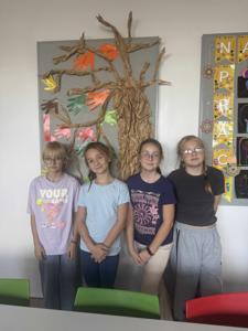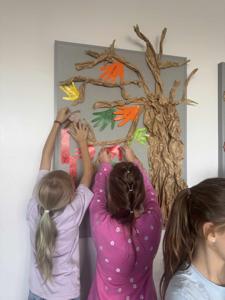 Drzewo przyjaźni stworzone na zajęciach świetlicowych to kolorowa praca plastyczna symbolizująca więzi między uczniami. Pień i gałęzie drzewa wykonane zostały wspólnie, a liście to odciski dłoni dzieci, na ktorych zapisali cechy dobrej przyjaźni – takie jak życzliwość, zaufanie i pomoc. Drzewo pokazuje, jak ważne są relacje w grupie i jak każdy z nas wnosi coś wyjątkowego do wspólnoty.