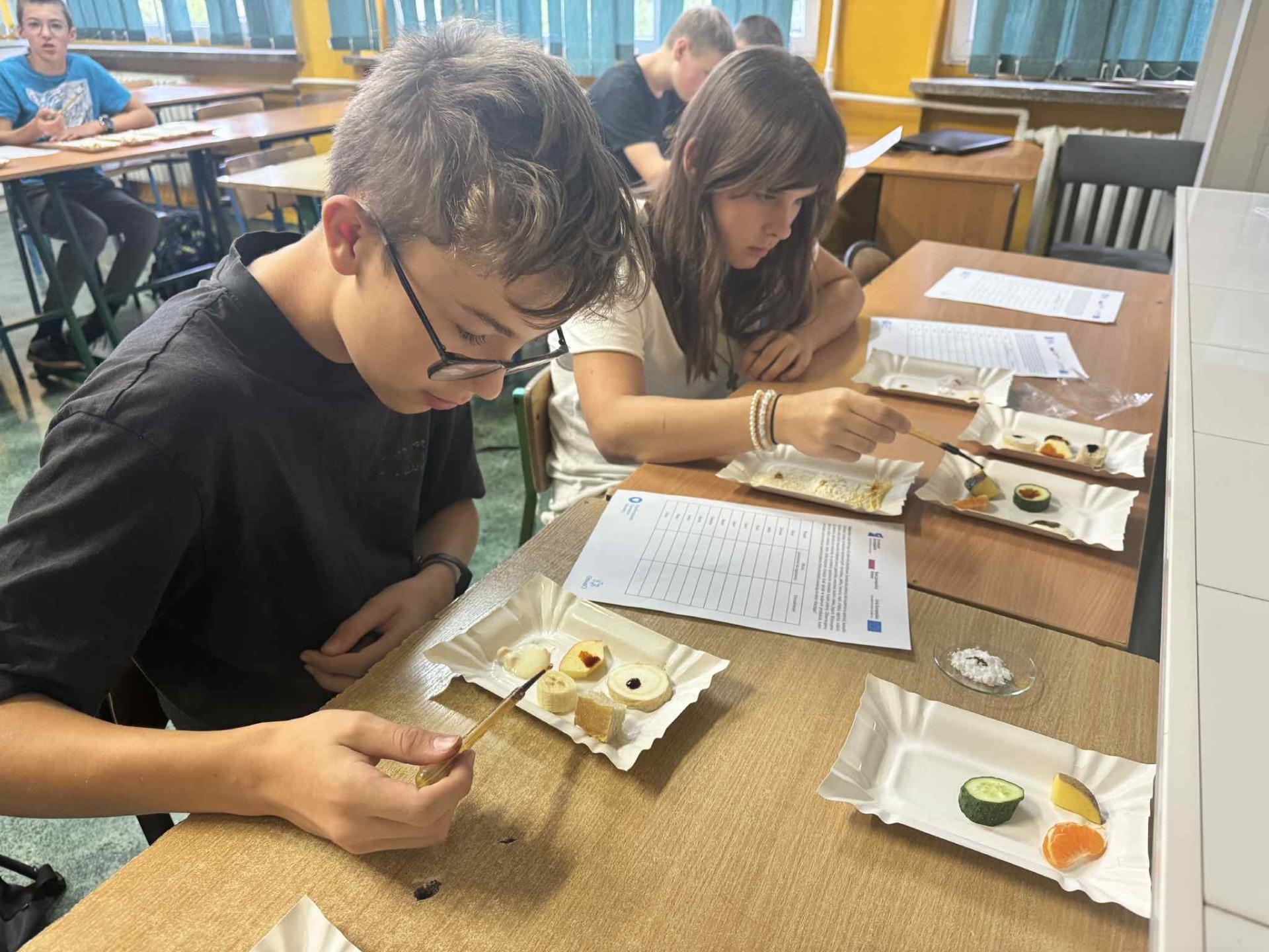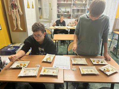 Na zajęciach kółka chemicznego uczniowie badali zawartość skrobi w produktach spożywczych. Do próbek chleba, ziemniaka, makaronu czy jabłka dodawali płyn Lugola. Tam, gdzie występowała skrobia, pojawiało się charakterystyczne granatowe zabarwienie. Doświadczenie pokazało, że chemia to nie tylko teoria, ale także ciekawe odkrycia w codziennym życiu.