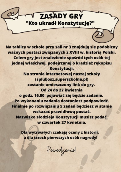 24 kwietnia 2023 Aktualności Gra "Kto ukradł Konstytucję?" Na tablicy w szkole przy sali nr 3 znajdują się podobizny ważnych postaci związanych z XVIII w. historią Polski. Celem gry jest znalezienie spośród tych osób tej Czytaj więcej