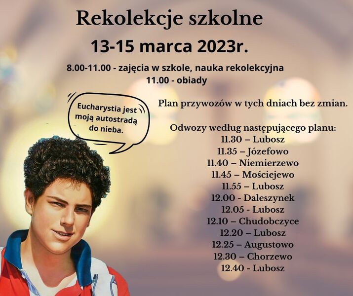 11 marca 2023 Aktualności Rekolekcje szkolne Rekolekcje szkolne 13-15 marca 2023r. 8.00-11.00 - zajęcia w szkole, nauka rekolekcyjna 11.00 - obiady Plan przywozów w tych dniach bez zmian. Odwozy według następującego planu: 11.30... Czytaj więcej