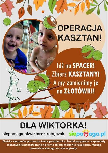 05 października 2022 Aktualności Zbieramy kasztany, aby pomóc! UWAGA! OPERACJA KASZTAN!Do 27 października zbieramy kasztany, które zostaną zmienione na złotówki i przekazane będą na rzecz chorego Wiktorka. Zachęcamy do włączenia się w akcję i przynoszenie... Czytaj więcej
