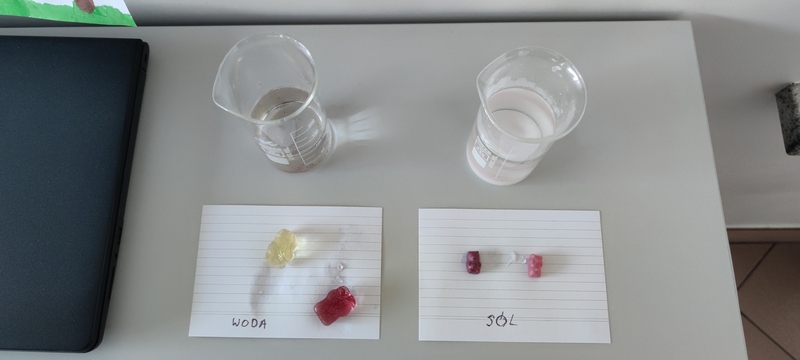 Jeden żelek umieszczamy w wodzie, a drugi w stężonym roztworze soli, czekamy 24 godziny. Po upływie tego czasu żelek z soli okazuje się Liliputem, a żelek z wody urósł do postaci Olbrzyma.