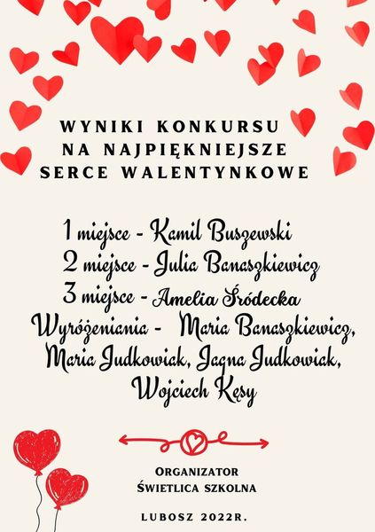 11 marca 2022 Świetlica szkolna i stołówka Rozstrzygnięcie konkursu "Najpiękniejsze serce walentynkowe" Galeria: https://www.facebook.com/media/set/?set=a.3168628266799735&type=3 Czytaj więcej