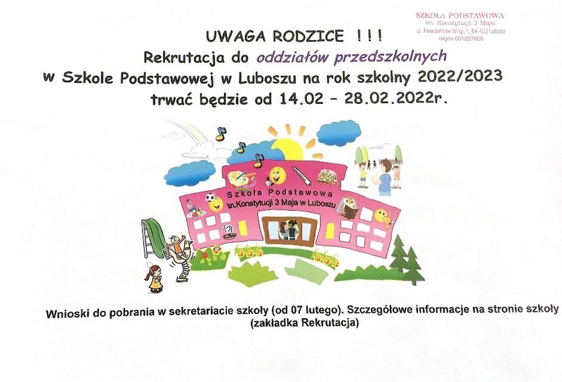 01 lutego 2022 Aktualności Rekrutacja 2022/2023 Uwaga Rodzice! dzieci uczęszczajcych do oddziałów przedszkolnych od "3-5" oraz dzieci "0" ważne informacje w zakładce "rekrutacja 2022/2023" Czytaj więcej