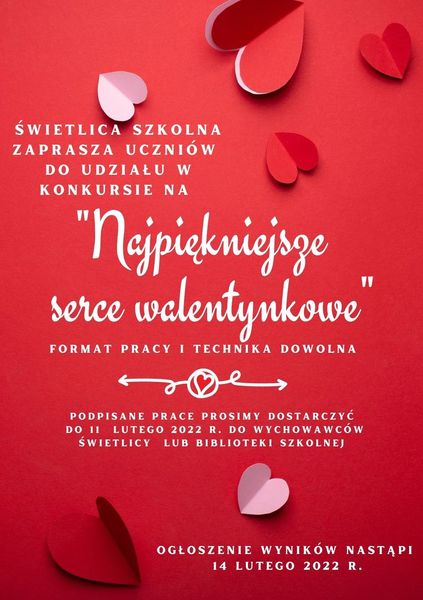 04 lutego 2022 Świetlica szkolna i stołówka Konkurs na najpiękniejsze serce walentynkowe Czytaj więcej